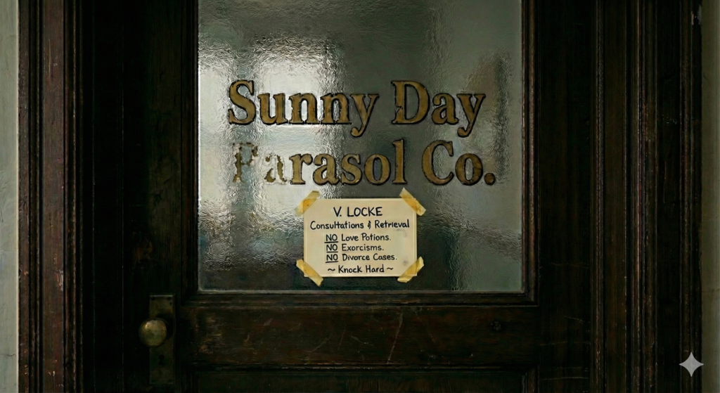 The top half of the door was a sheet of rippled, frosted glass—the kind that held secrets and distorted light. Across it, in gold leaf that had seen better days and too many storms, were the ghosted words: “Sunny Day arasol Co.” The “P” from “Parasol” was long gone, a victim of time or perhaps a better offer. Given the constant, charged downpour outside, the name wasn’t just ironic; it was a cheap, cruel joke left by some long-dead, blind optimist.